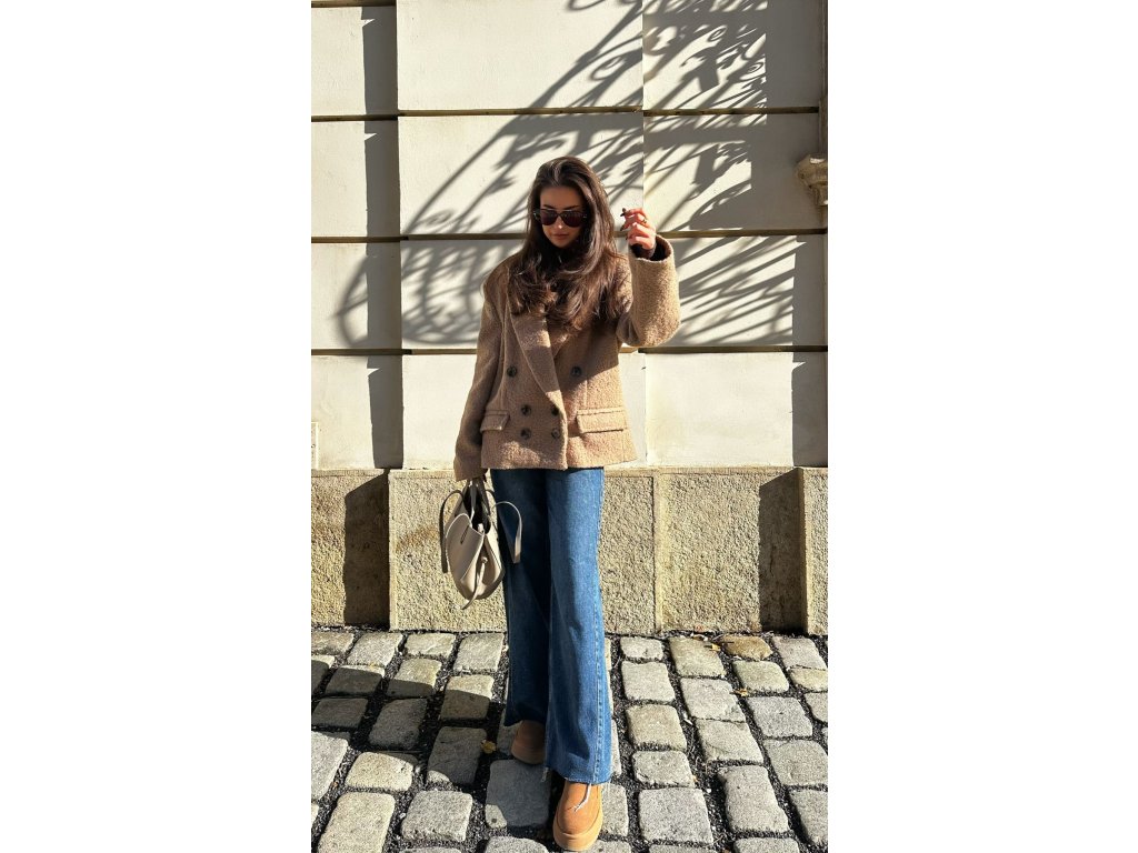 Hrejivý dámsky kabát z hrubšieho mäkkého materiálu v krásnom teplom odtieni béžovej. Má voľnejší strih, ktorý sa skvele hodí na vrstvenie a vytvára módny, nadčasový look. Zapínanie na gombíky, klasické klopy a praktické vrecká. Vhodný do mesta aj na prechádzky – štýlový a zároveň pohodlný.