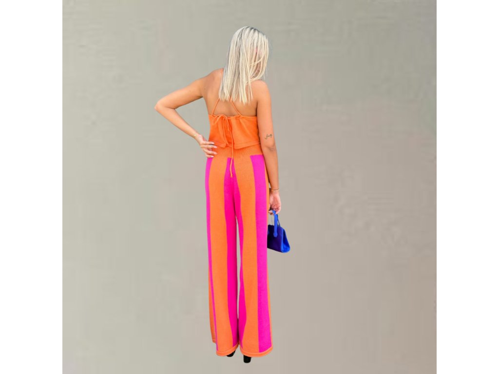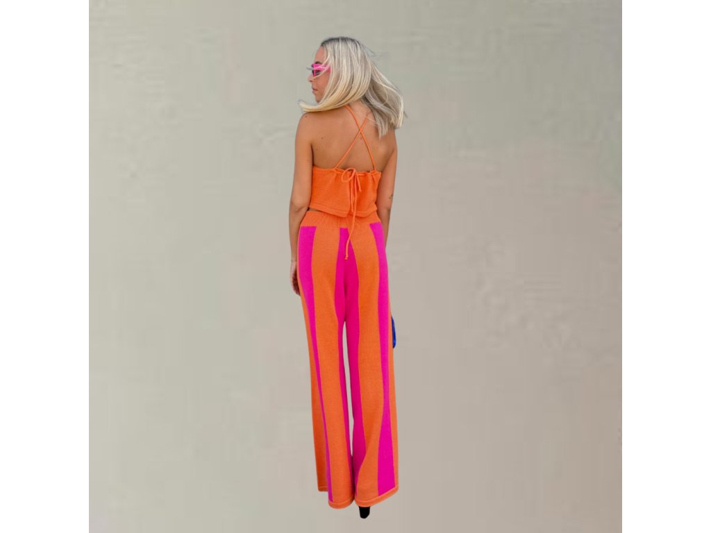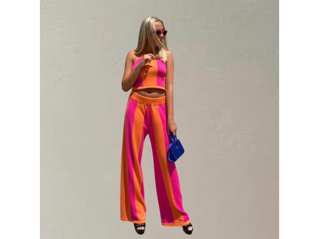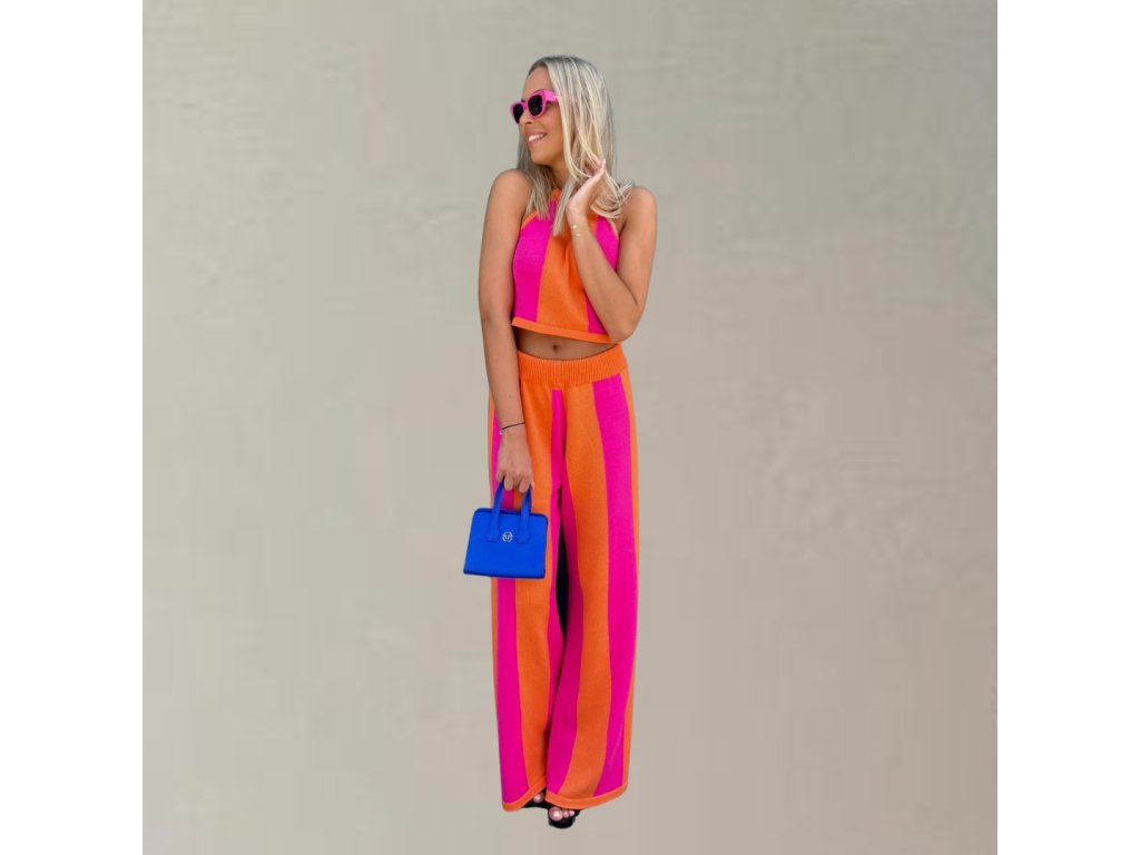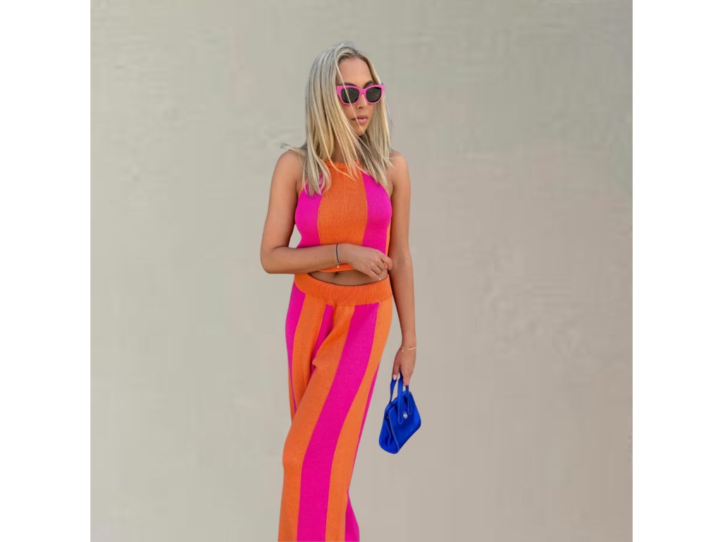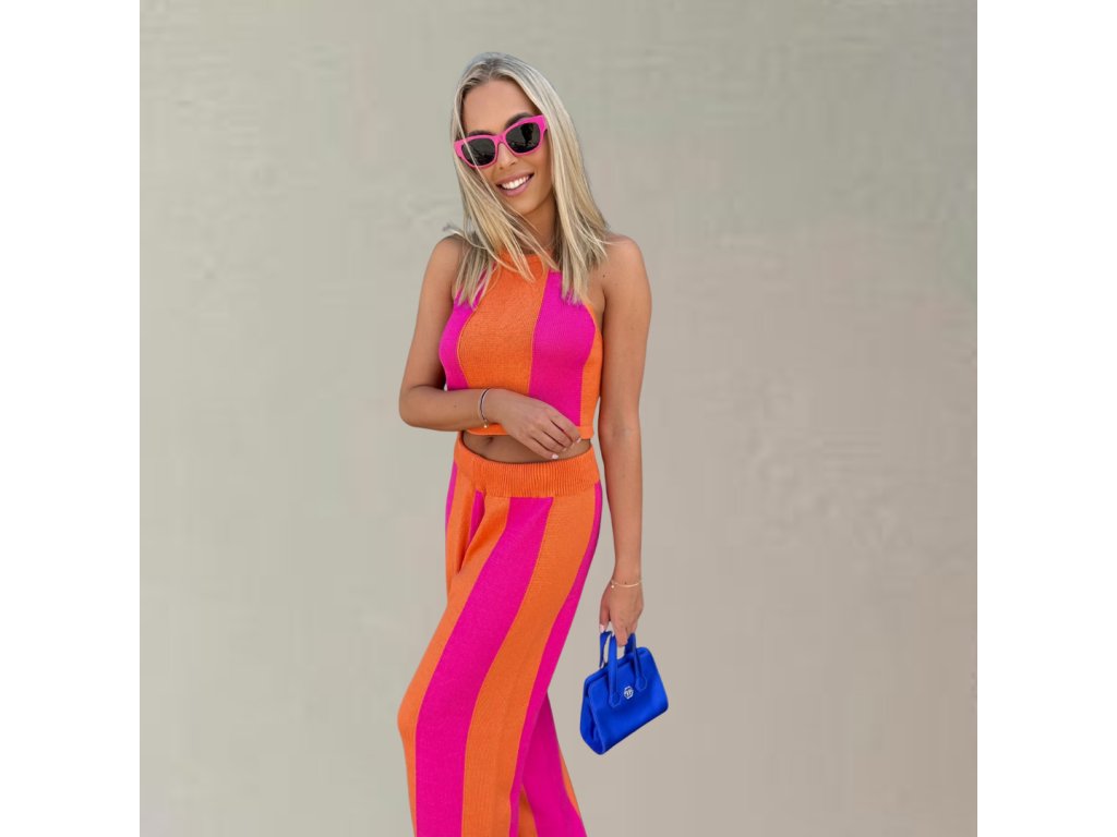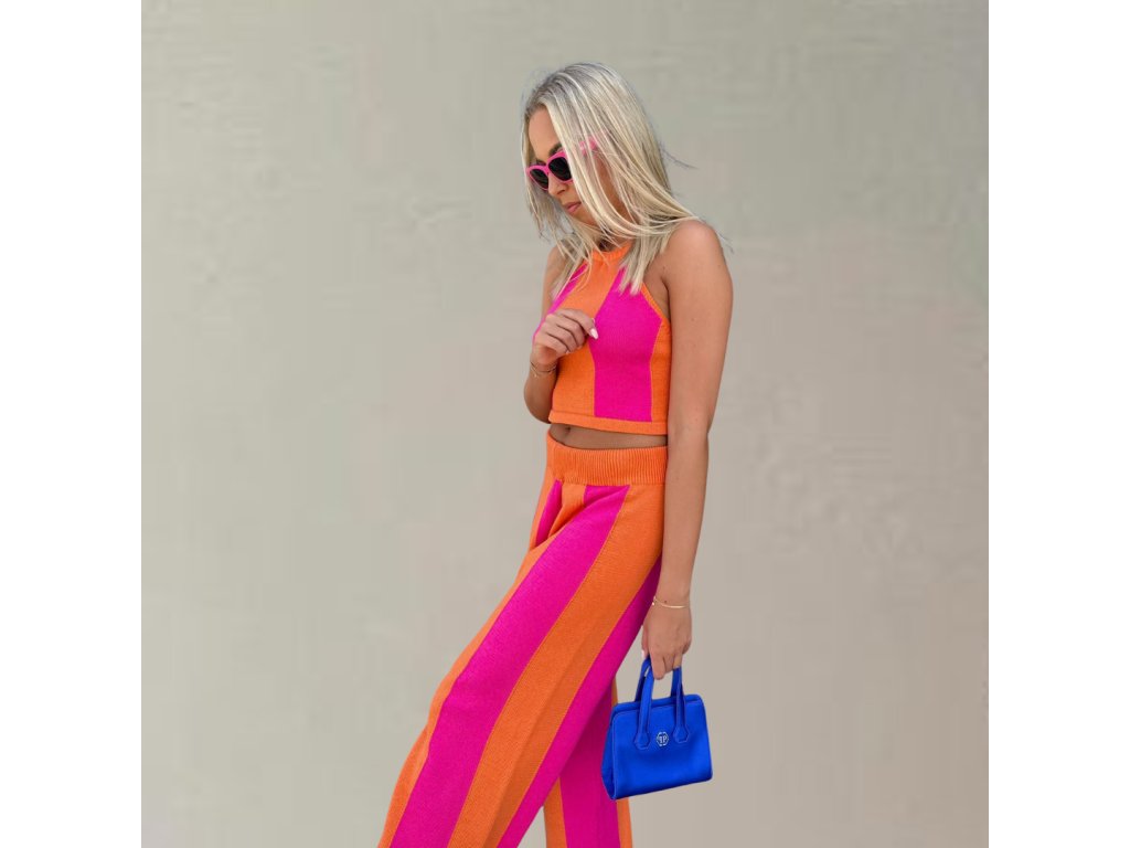Odvážny a chic letný komplet z mäkkej pleteniny – kratší top bez rukávov a pohodlné široké nohavice s pružným pásom. Kombinácia oranžovej a fuchsiovej vytvára neprehliadnuteľný look, ktorý je perfektný na letné prechádzky, brunch s kamoškami alebo fotky na Instagrame. Buď nezameniteľná – buď svojou vlastnou inšpiráciou.