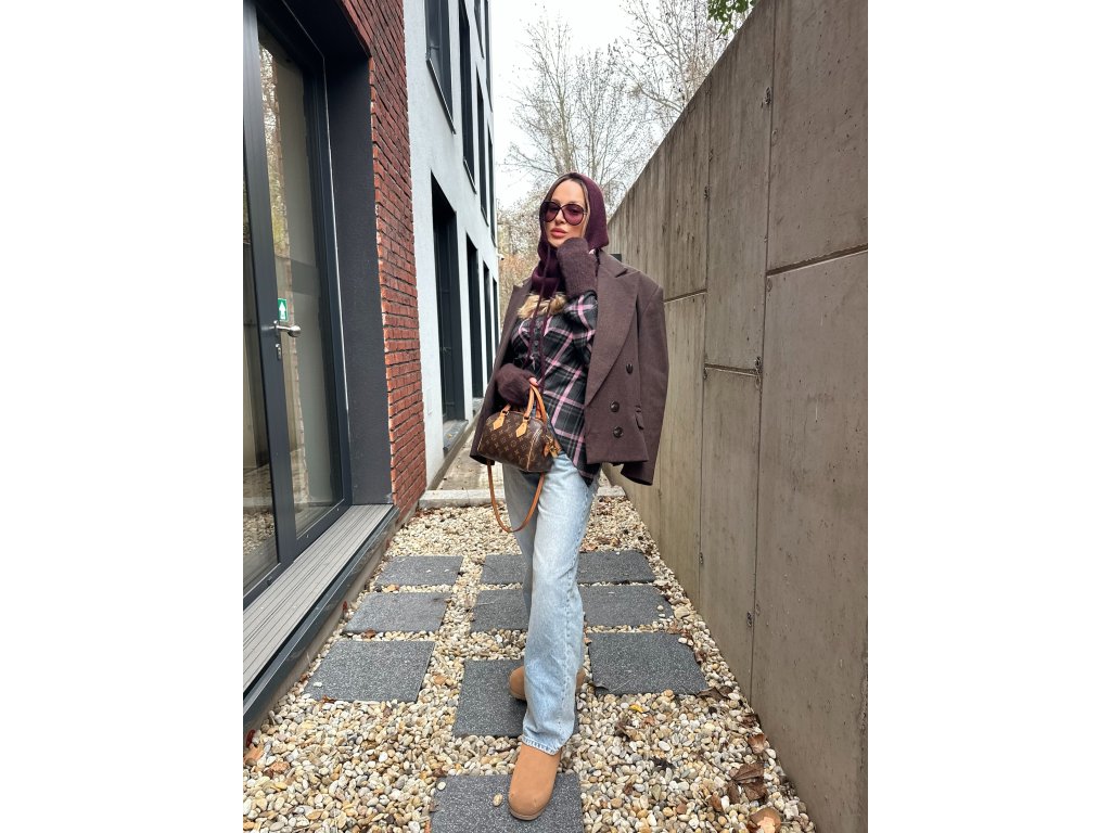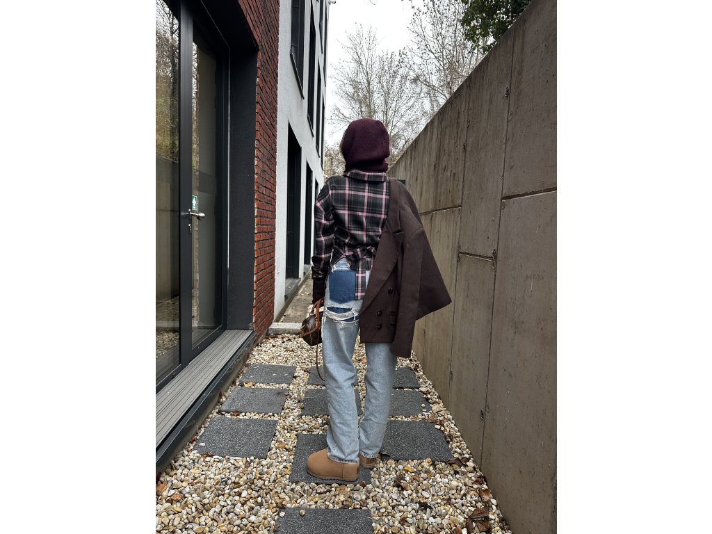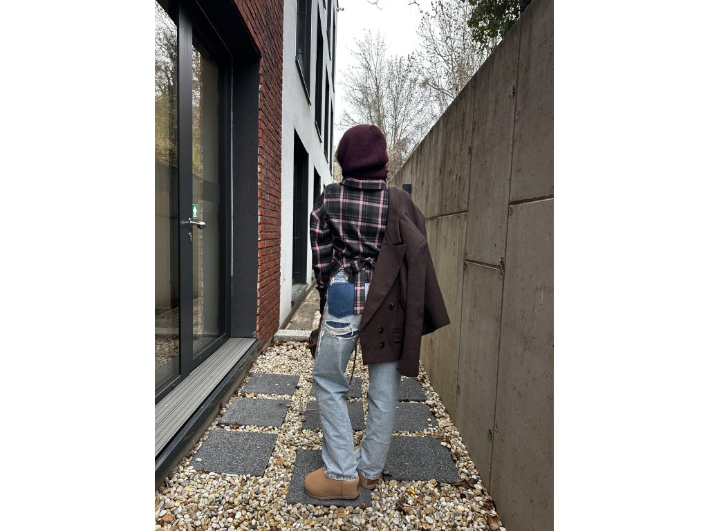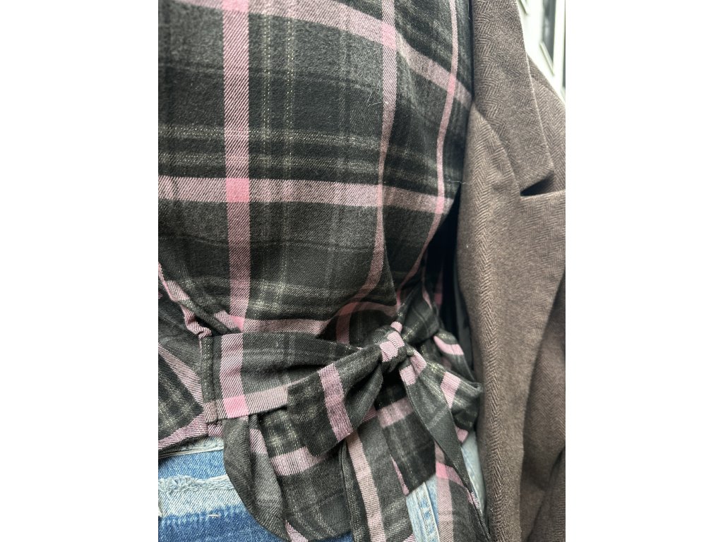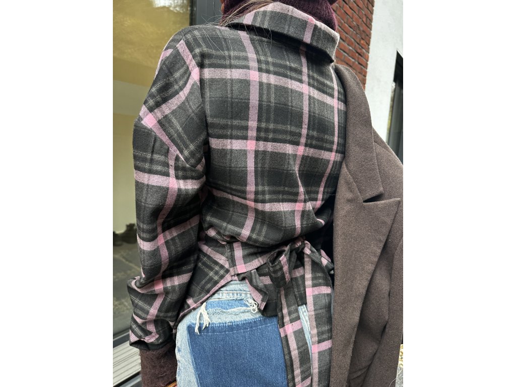 Hrubšia károvaná košeľa v štýle fraku vzadu na zaväzovanie. Šedo-staroružová farebná kombinácia. Ideálna na vrstvenie a nositeľná k rifliam alebo aj v elegantom štýle. Košeľa je v univerzálnej veľkosti, ideálna pre veľkosti XS, S a M.