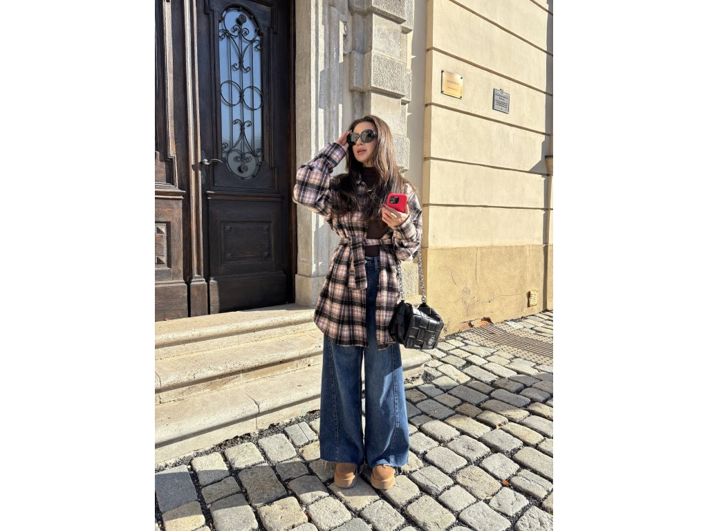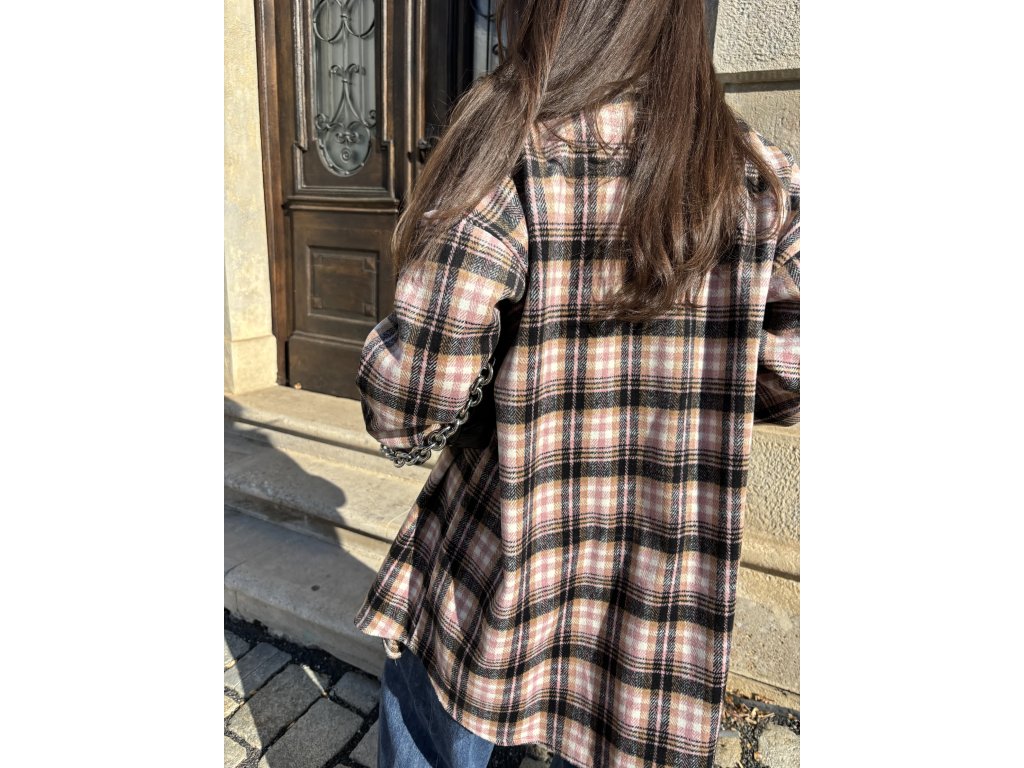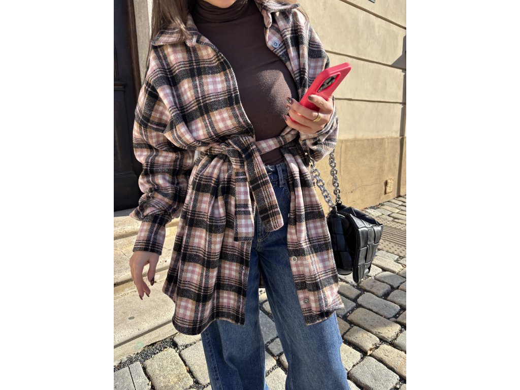 Predĺžená hrubšia flanelová košeľa v štýle oversize na zaväzovanie s opaskom v páse. Béžovo-ružovo-čierna farebná kombinácia a károvaná vzorka. Ideálna na vrstvenie, nositeľná ako košeľa, ale aj ako ľahký kabátik.