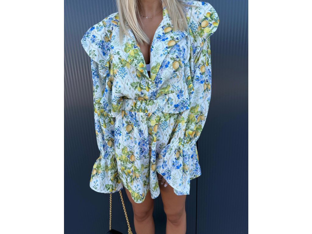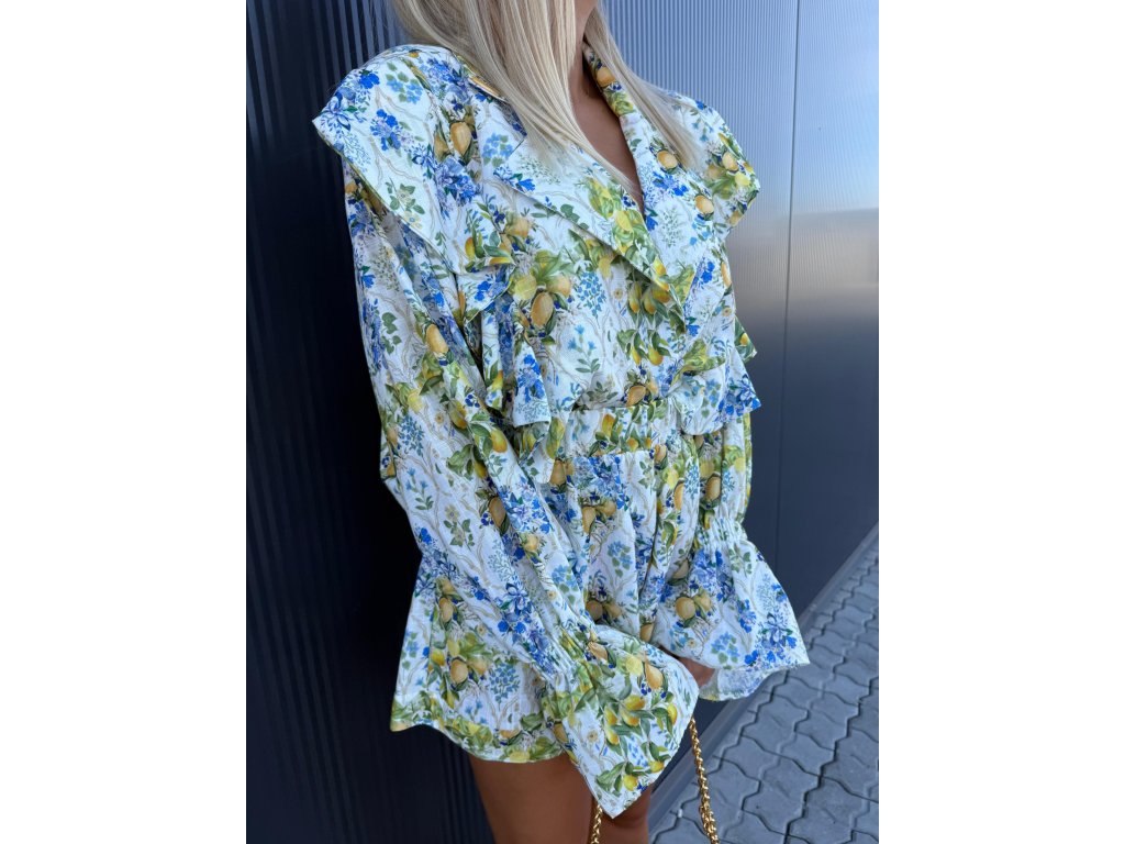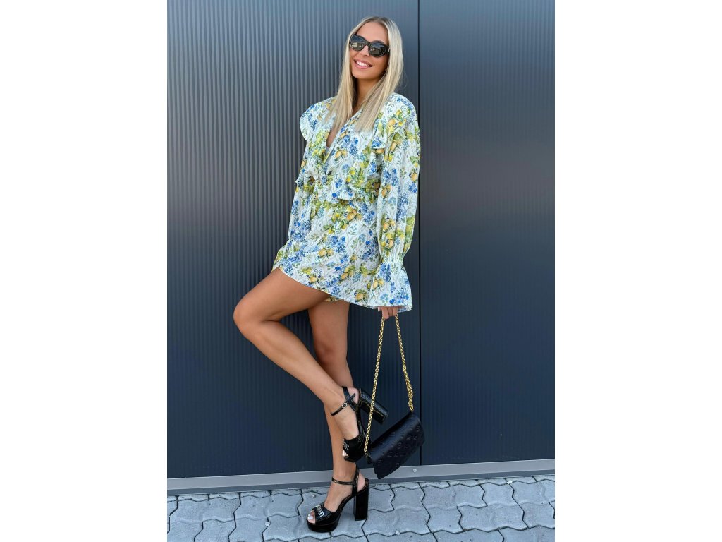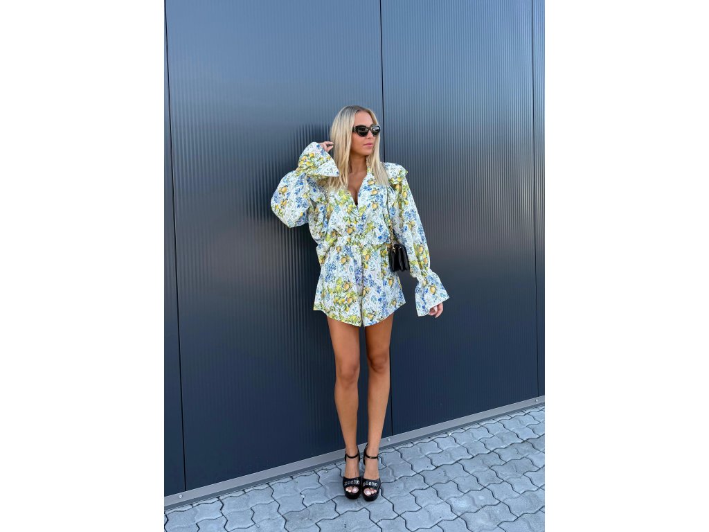 Dámsky kvetovaný komplet z ľahkého, vzdušného materiálu — skladá sa z košele s dominantnými balónovými rukávmi a kraťasov s vysokým pásom na gumičku. Romantický florálny vzor v kombinácii modrej, zelenej, žltej a bielej vytvára svieži a ženský look, ideálny na leto. Elegantný a zároveň pohodlný kúsok, ktorý vynosíš do mesta aj na dovolenkové prechádzky. Jednoducho v ňom rozkvitneš.