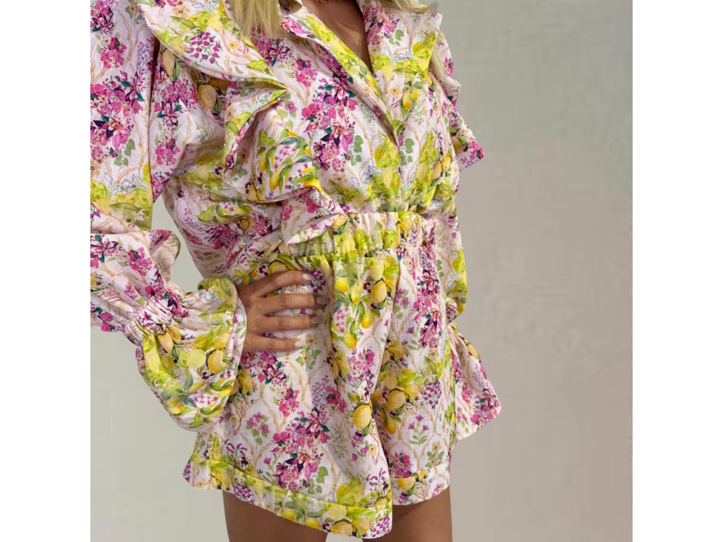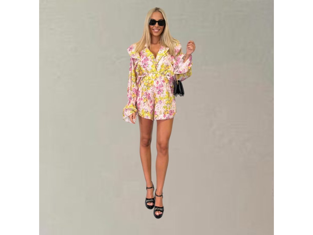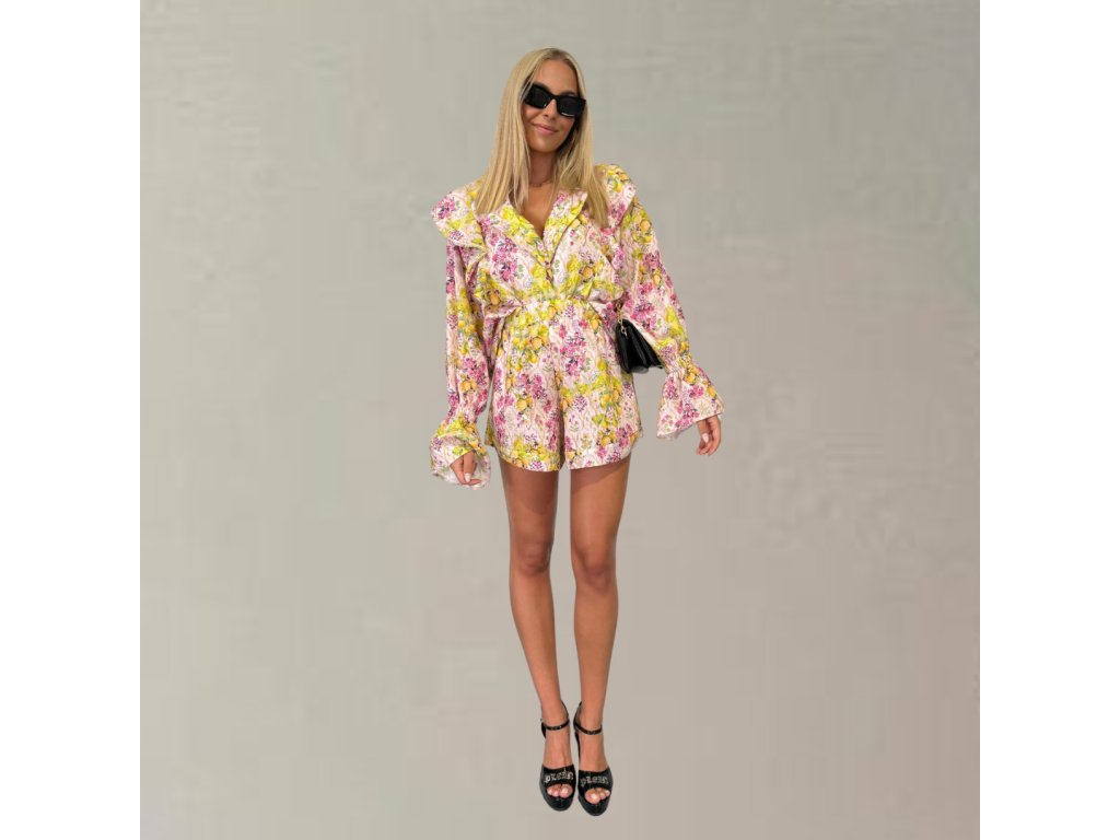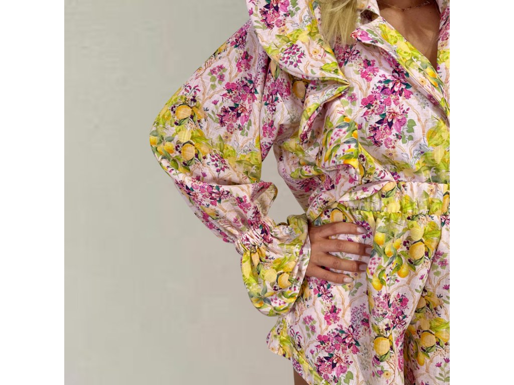 Dámsky kvetovaný komplet z ľahkého, vzdušného materiálu — skladá sa z košele s dominantnými balónovými rukávmi a kraťasov s vysokým pásom na gumičku. Romantický florálny vzor v kombinácii ružovej, žltej a bielej vytvára svieži a ženský look, ideálny na leto. Elegantný a zároveň pohodlný kúsok, ktorý vynosíš do mesta aj na dovolenkové prechádzky. Jednoducho v ňom rozkvitneš.