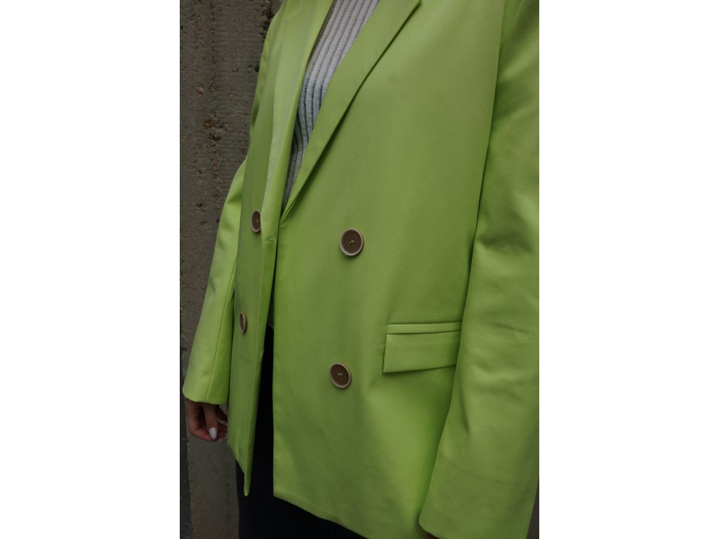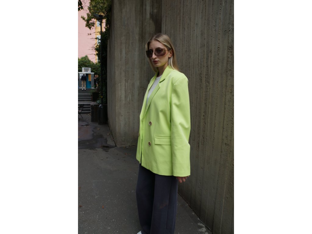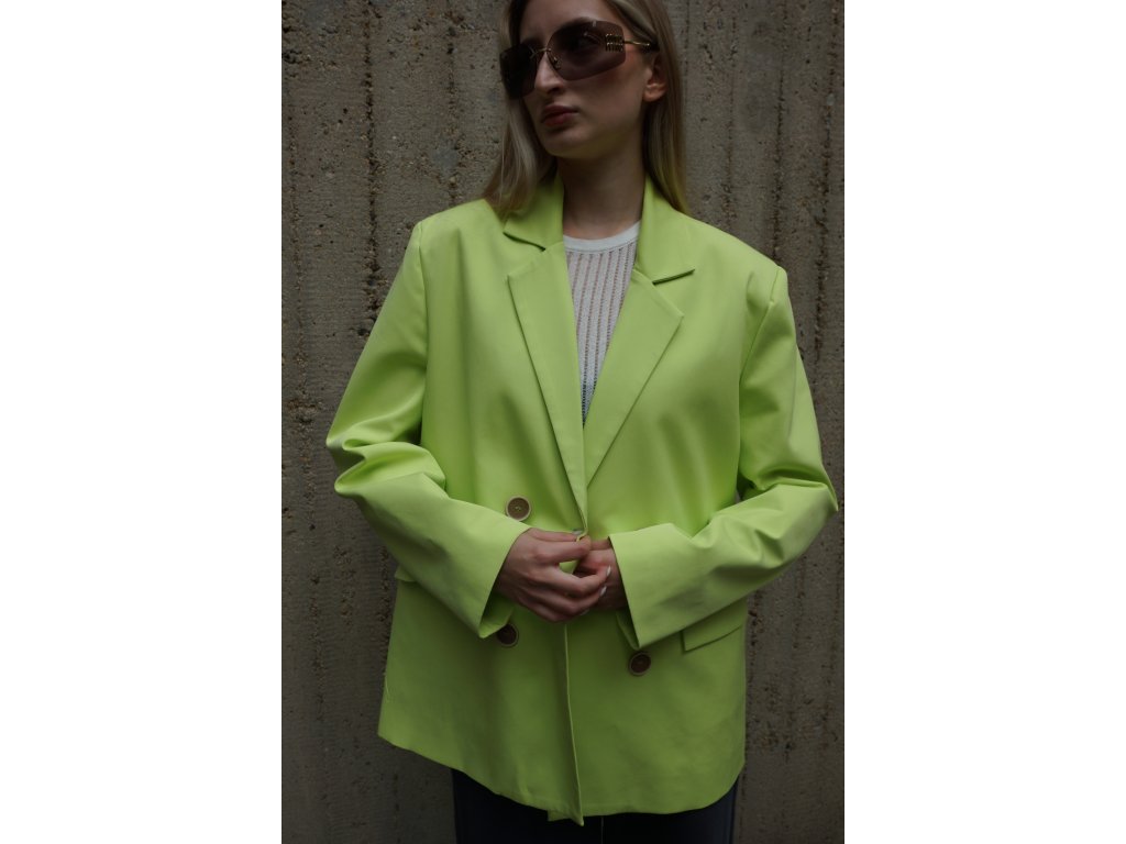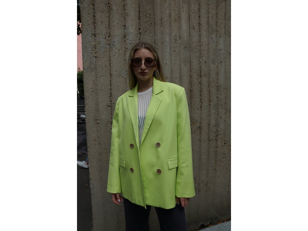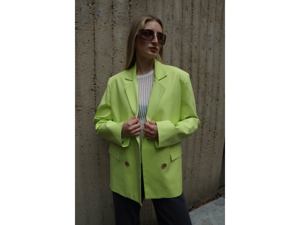 Elegantné dámske sako v trendovej zeleno-žltej neónovej farbe s dvojradovým zapínaním a jemne oversized strihom. Štýlový kúsok, ktorý krásne ladí s minisukňou alebo nohavicami s vysokým pásom. Ideálne na každodenné nosenie aj špeciálne príležitosti. Dotvorí každý tvoj look s dávkou ženského šarmu. Budeš v ňom vždy šik a to potrebuješ.