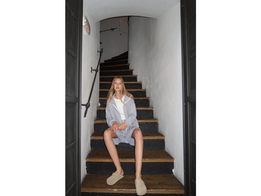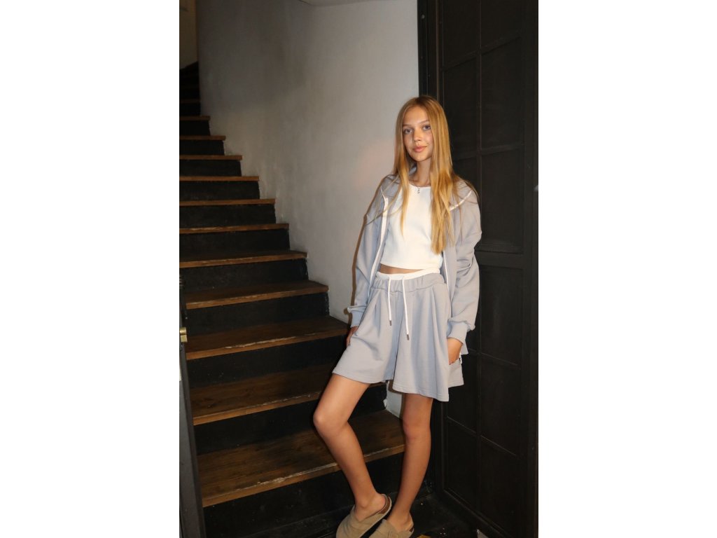 Trojdielny set z jemnej bavlnenej teplákoviny – crop tielko, oversized mikina s kapucňou a krátke nohavice s vysokým pásom. Pohodlný voľný strih, praktické vrecká a pastelová šedomodrá farba vytvárajú dokonalý outfit pre relax, domáce chvíľky aj nenútený mestský streetwear. Univerzálna veľkosť (Ideálne pre veľkosť S,M)