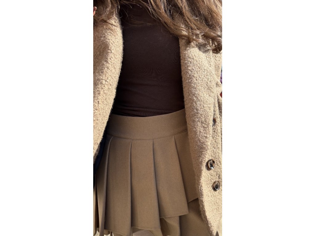 Elegantný skort s vysokým pásom, ktorý spája vzhľad sukne a pohodlie šortiek. Jemne splývavý materiál vytvára ženskú siluetu a zabezpečuje komfort pri nosení. Nadčasový neutrálny odtieň sa ľahko kombinuje do každodenných aj elegantných outfitov.