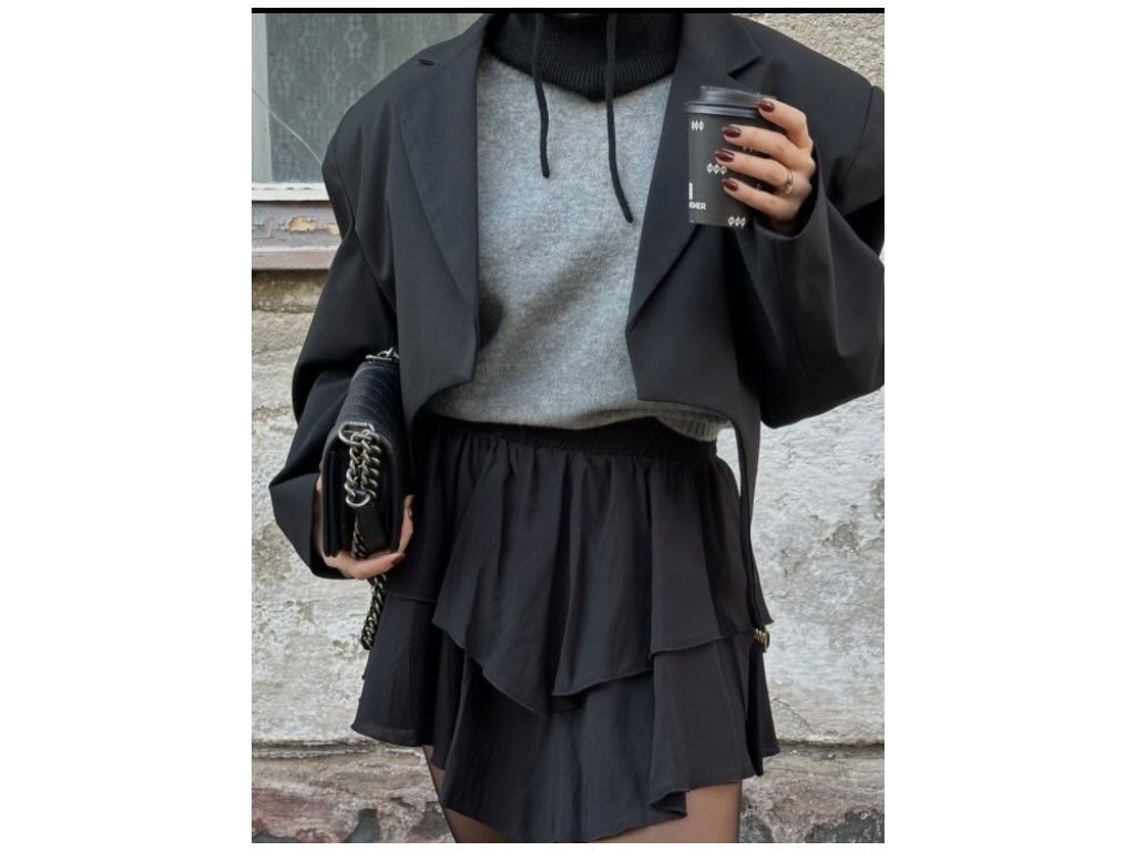 Čierny skort s volánovým strihom a elastickým pásom je skvelým a najmä premysleným kúskom do tvojho šatníka. Kombinuje praktickosť kraťasov s elegantným vzhľadom sukne, čo určite oceníš. Ľahký vzdušný materiál doslova pohladí tvoje telo a je ideálny pre letné dni. Tento hravý kúsok dodá tvojmu outfitu ženskosť a pohodlie. Budeš z neho nadšená. Ideálny pre veľkosti XS, S a M.