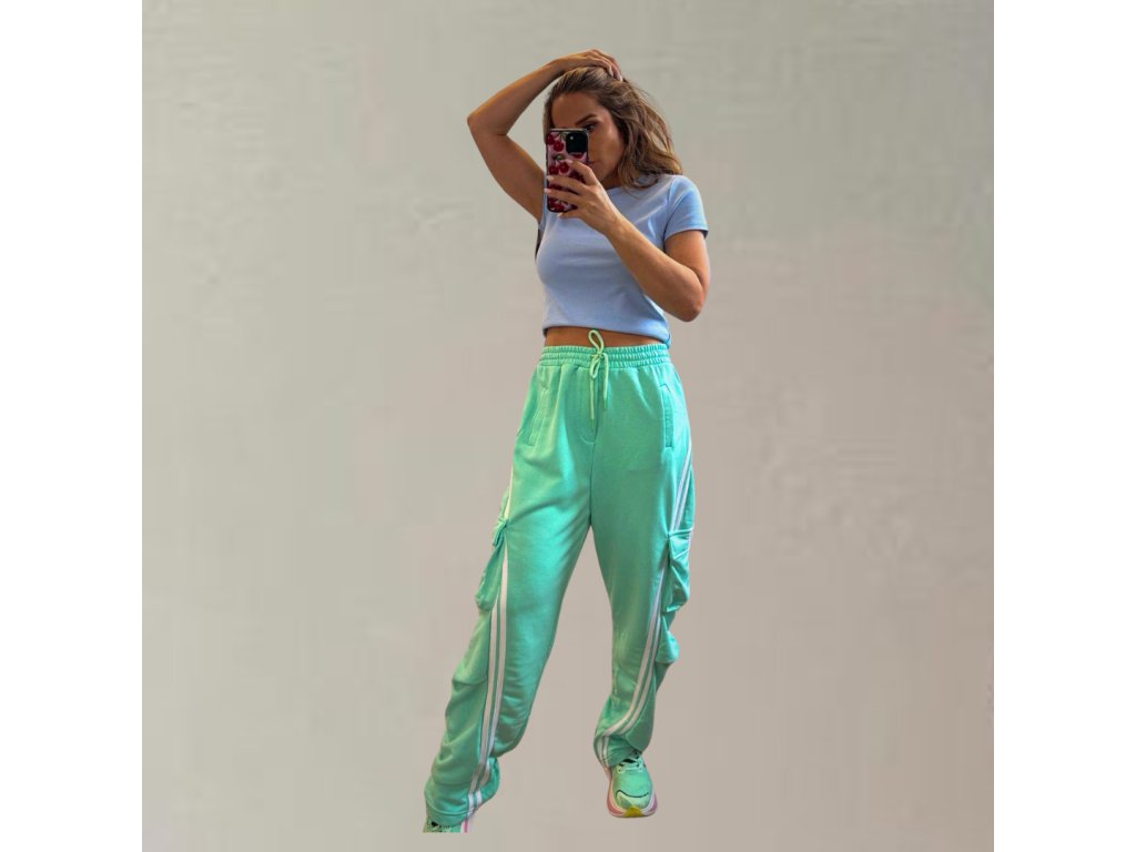 Štýlové mentolovo zelené tepláky s voľným pohodlným strihom a výraznými bočnými pásikmi. Mäkký materiál, elastický pás so šnúrkou a praktické vrecká z nich robia ideálny kúsok na každý deň – či už si doma, na káve s kamoškou alebo na prechádzke mestom. Dokonalé spojenie pre pohodlnosť a ženskú energiu. Toto je ďalší kúsok "must-have" v tvojom šatníku.