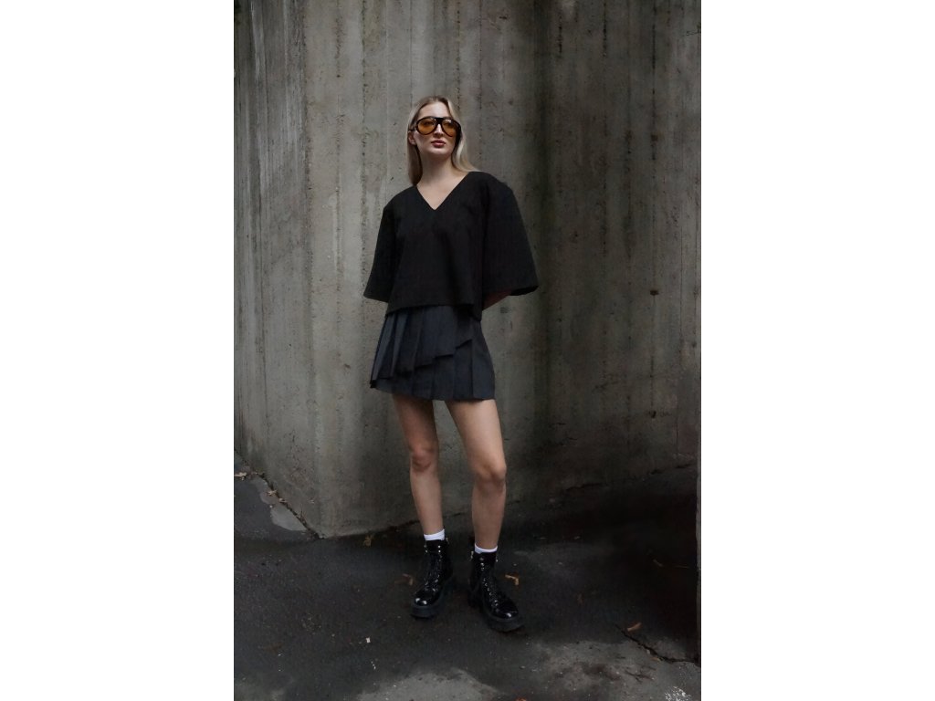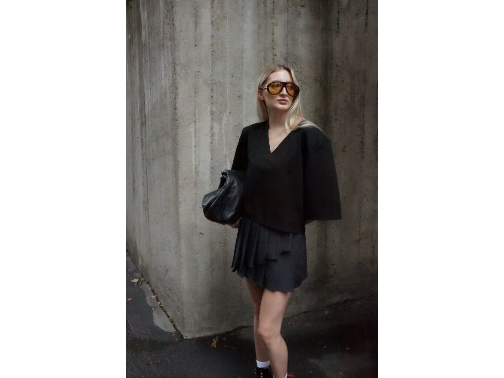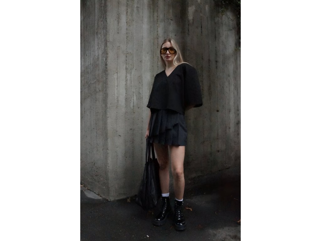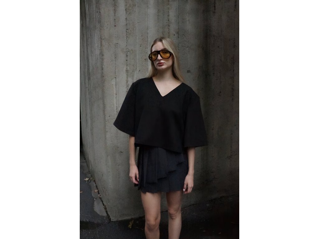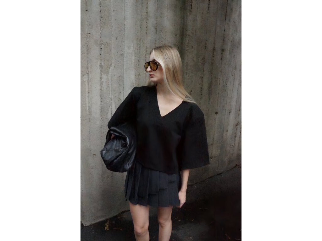 Štýlový top v čiernej farbe. Moderný strih s vypchávkami na ramenách a širokými rukávmi dodáva celkovému vzhľadu elegantnú štruktúru a sebavedomý akcent. Ideálny kúsok na vytvorenie výrazného, no stále chic outfitu. Tričko je v univerzálnej veľkosti.