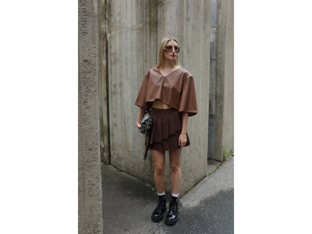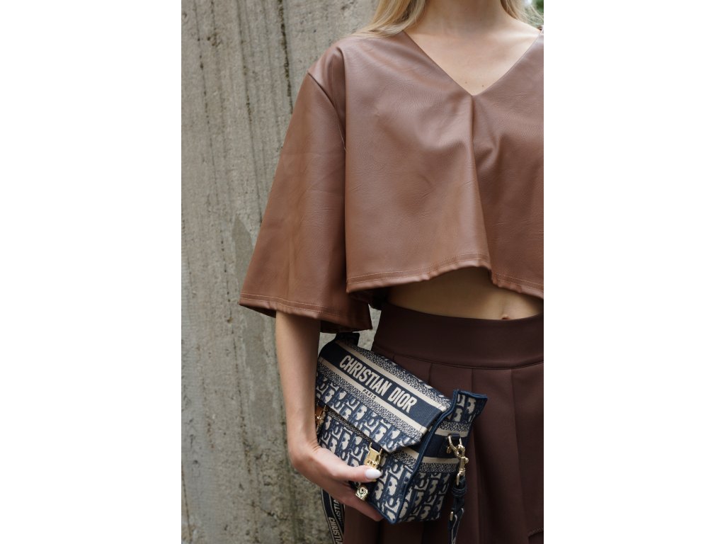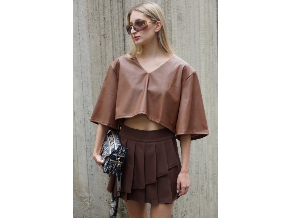 Štýlový top v hnedej farbe z kvalitnej imitácie kože. Moderný strih s vypchávkami na ramenách a širokými rukávmi dodáva celkovému vzhľadu elegantnú štruktúru a sebavedomý akcent. Ideálny kúsok na vytvorenie výrazného, no stále chic outfitu. Tričko je v univerzálnej veľkosti.