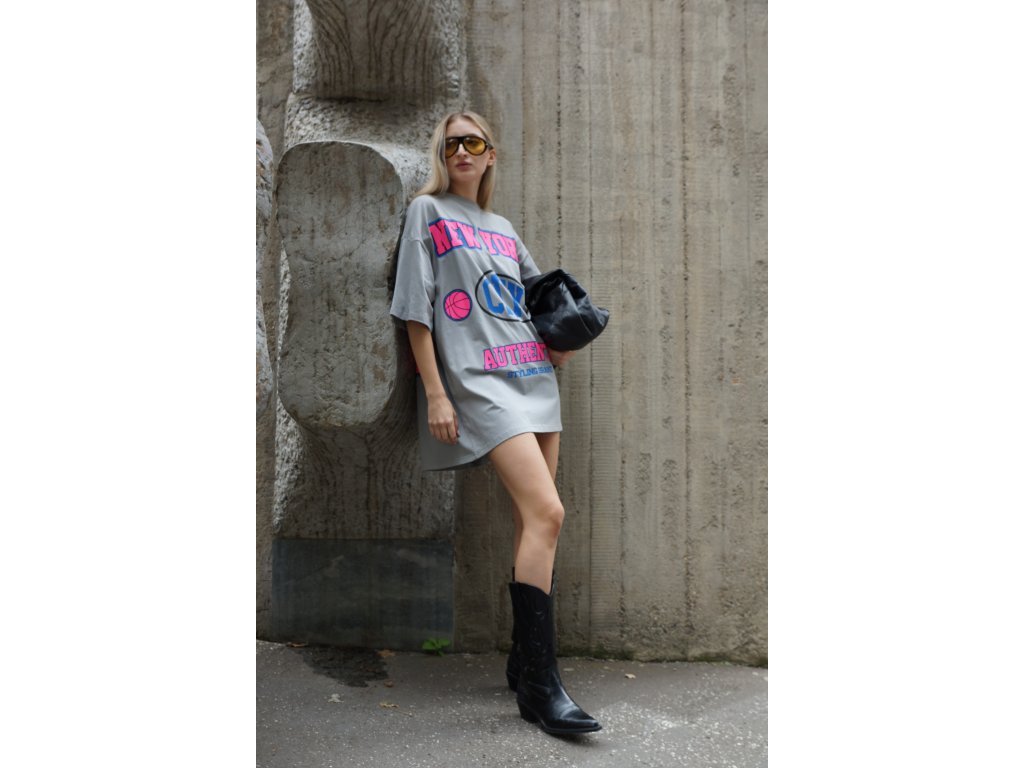 Trendové oversized tričkošaty s výraznou trendy potlačou *NEW YORK CITY* v sivej farbe. Príjemný, mäkký materiál a voľný pohodlný strih. Ideálne pre každodenný mestský look s nádychom slobody a štýlu. V tomto kúsku sa budeš cítiť štýlová, sebavedomá a slobodná. Navyše, tento voľný strih lichotí každej postave a zároveň ti ponúka nekonečné možnosti - tento kúsok môžeš nosiť ako šaty, k legínam, alebo len tak si ho "nahodiť" počas voľného víkendu doma či von.